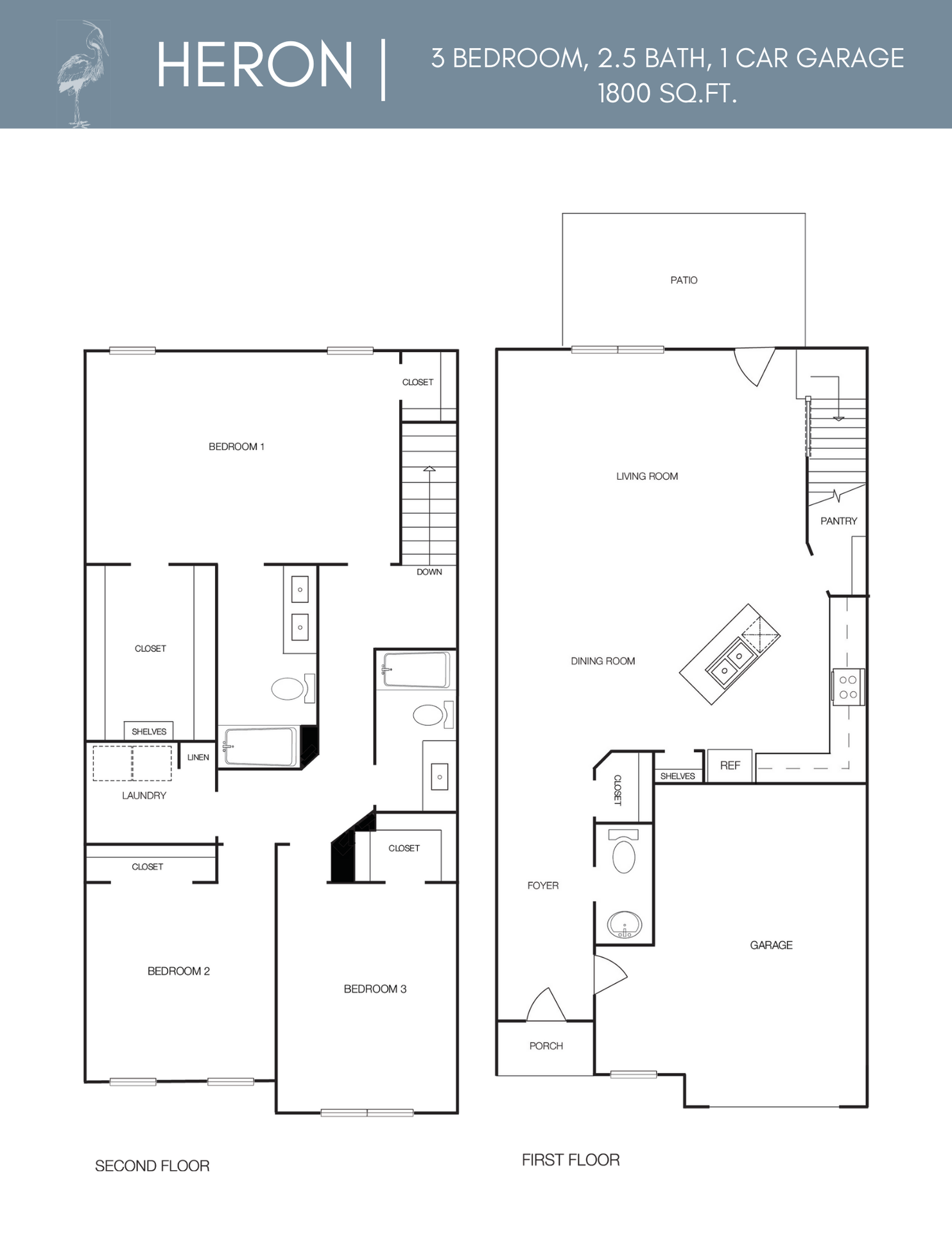Heron | 3 Bed 2.5 Bath | Garage | 1800 sf | $2699-$3104 | 6, 7, 8, 9, 11, 12, 13, 14, 15 and 18 month lease terms