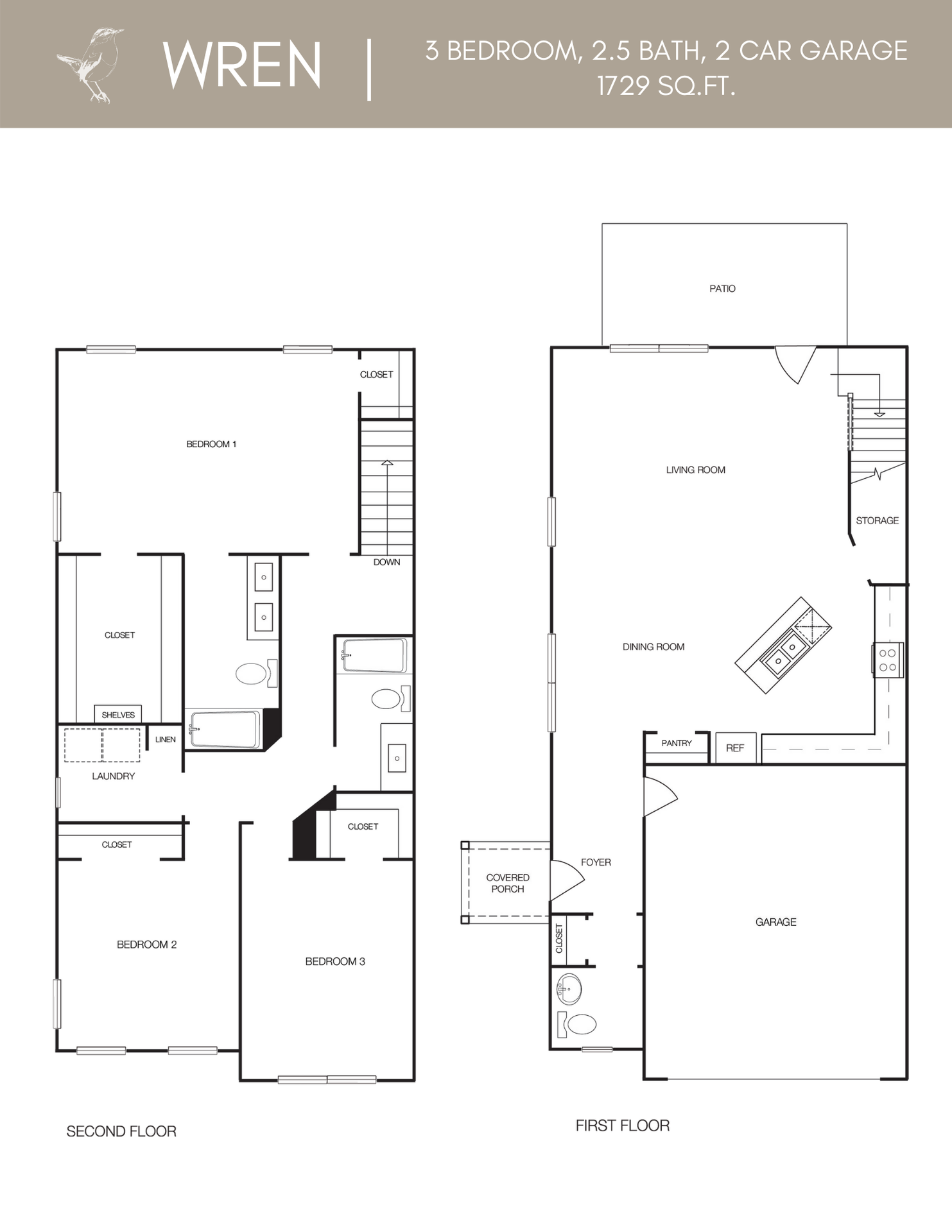 Wren | 3 Bed 2.5 Bath | Garage | 1729 sf | $2825 - $3249 | 6, 7, 8, 9, 11, 12, 13, 14, 15 and 18 month lease terms
