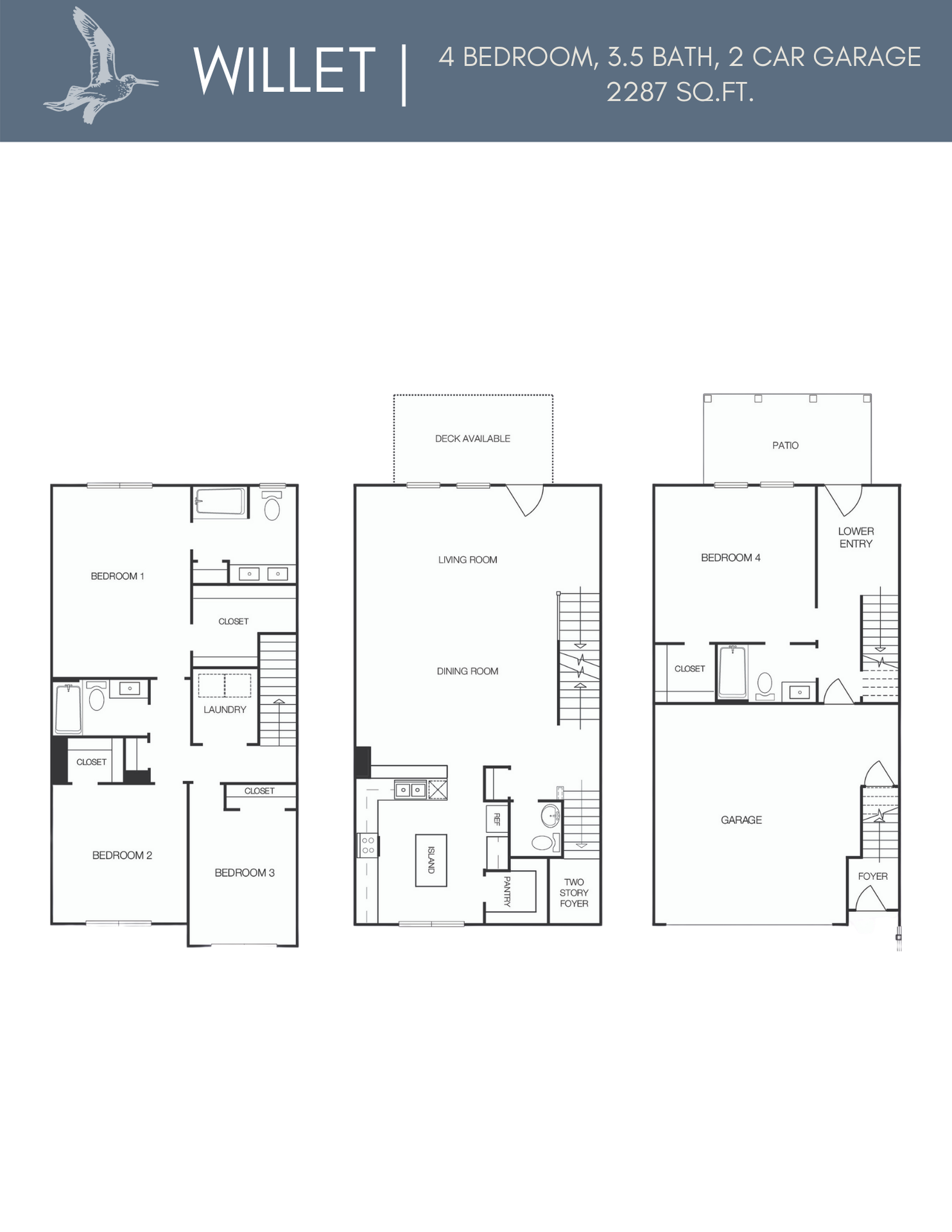 Willet | 4 Bed 3.5 Bath | Garage | 2287 sf | $3100 - $3680 | 6, 7, 8, 9, 11, 12, 13, 14, 15 and 18 month lease terms